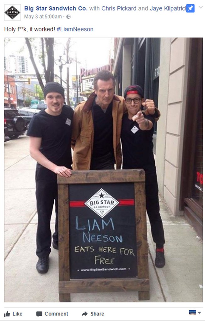 O Liam Neeson βρήκε χρόνο ανάμεσα στα γυρίσματα που είχε στο Βανκούβερ να επισκεφτεί ένα εστιατόριο της περιοχής, το οποίο έγραψε πως θα τον κερνούσε.