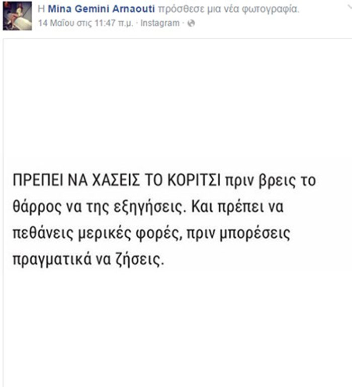 Ρίχνοντας μια ματιά στον προσωπικό της λογαριασμό στο facebook καταλαβαίνεις, ότι η Μίνα είναι ένα κορίτσι που δεν αφήνει καμιά στιγμή να περάσει τυχαία από μπροστά της.