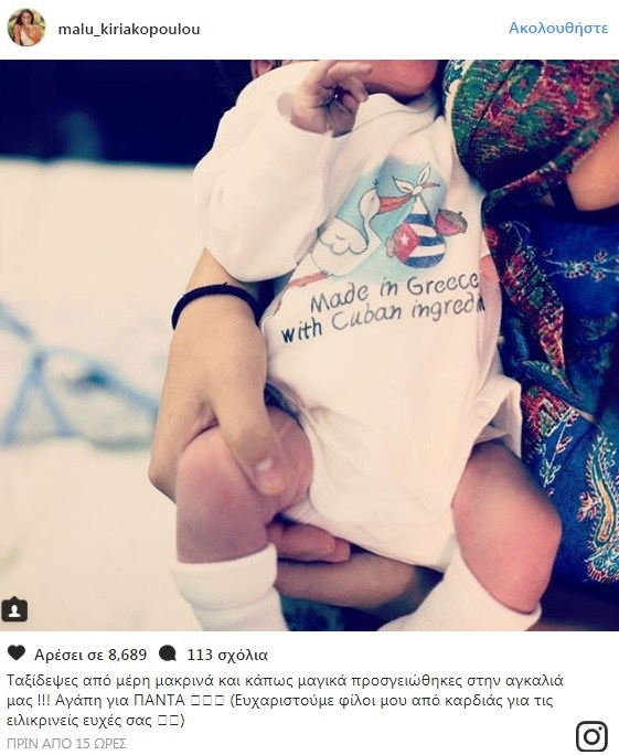 Η Μαλού ανέβασε πριν λίγες ώρες την πρώτη φωτογραφία του παιδιού της στην αγκαλιά του συντρόφου της, φορώντας ένα φορμάκι που προφανώς το σκέφτηκαν οι φίλοι τους και το τύπωσαν, γράφοντας: «Μade in Greece with Cuban ingredients». Η Μαλού έγραψε στη λεζάντα: «Ταξίδεψες από μέρη μακρινά και κάπως μαγικά προσγειώθηκες στην αγκαλιά μας !!! Αγάπη για ΠΑΝΤΑ (Ευχαριστούμε φίλοι μου από καρδιάς για τις ειλικρινείς ευχές σας)».