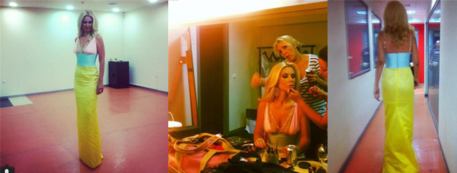 Για ακόμη μια φορά η Έφη Σκουρέλη που ανέλαβε το styling, επέλεξε μια δημιουργία της Σήλιας Κριθαριώτη. Το εντυπωσιακό look ολοκλήρωσαν τα πέδιλα της εταιρίας Casadei και τα κοσμήματα Serkos.