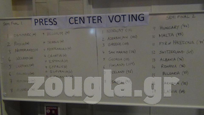 Οι ψηφοφορίες στα press center έχουν ξεκινήσει και η Ελλάδα φιγουράρει σε υψηλή θέση για τον τελικό, και συγκεκριμένα στην τρίτη, όπως διακρίνουμε στη φωτογραφία που μας έστειλε ο πρόεδρος του INFE, κ. Χρήστος Ζαφειρίδης.