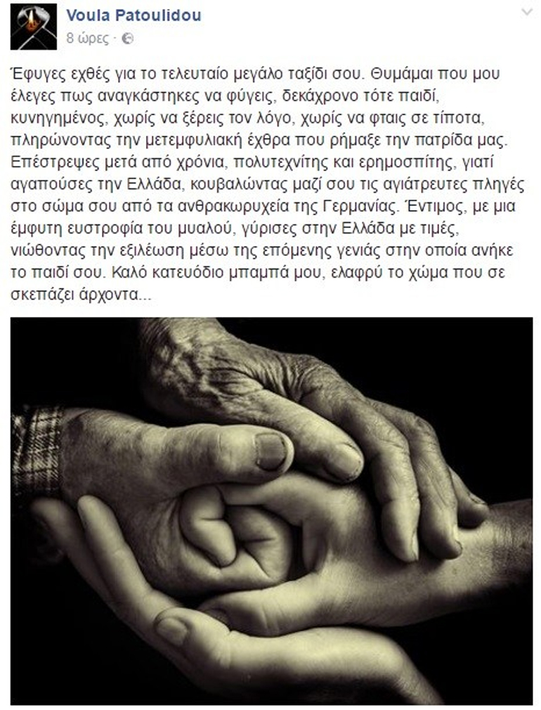 «Έφυγες εχθές για το τελευταίο μεγάλο ταξίδι σου. Θυμάμαι που μου έλεγες πως αναγκάστηκες να φύγεις, δεκάχρονο τότε παιδί, κυνηγημένος, χωρίς να ξέρεις τον λόγο, χωρίς να φταις σε τίποτα, πληρώνοντας την μετεμφυλιακή έχθρα που ρήμαξε την πατρίδα μας. Επέστρεψες μετά από χρόνια, πολυτεχνίτης και ερημοσπίτης, γιατί αγαπούσες την Ελλάδα, κουβαλώντας μαζί σου τις αγιάτρευτες πληγές στο σώμα σου από τα ανθρακωρυχεία της Γερμανίας. Έντιμος, με μια έμφυτη ευστροφία του μυαλού, γύρισες στην Ελλάδα με τιμές, νιώθοντας την εξιλέωση μέσω της επόμενης γενιάς στην οποία ανήκε το παιδί σου. Καλό κατευόδιο μπαμπά μου, ελαφρύ το χώμα που σε σκεπάζει άρχοντα…» έγραψε η Βούλα Πατουλίδου.