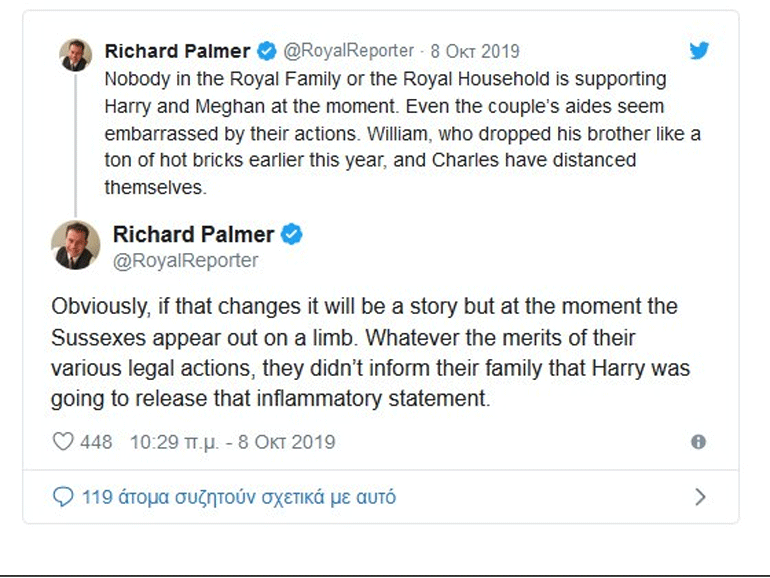 Στο τέλος μάλιστα προσθέτει «Σίγουρα αν αυτό αλλάξει, θα είναι ένα γεγονός αλλά αυτήν τη στιγμή ο Δούκας και η Δούκισσα του Sussex φαίνονται αποφασισμένοι για αυτό που κάνουν. Οποιαδήποτε κι αν είναι τα νομικά πλεονεκτήματα που θα έχουν από αυτές τις κινήσεις, δεν είχαν ενημερώσει την οικογένειά τους πως ο Harry θα ανακοίνωνε τις μηνύσεις».