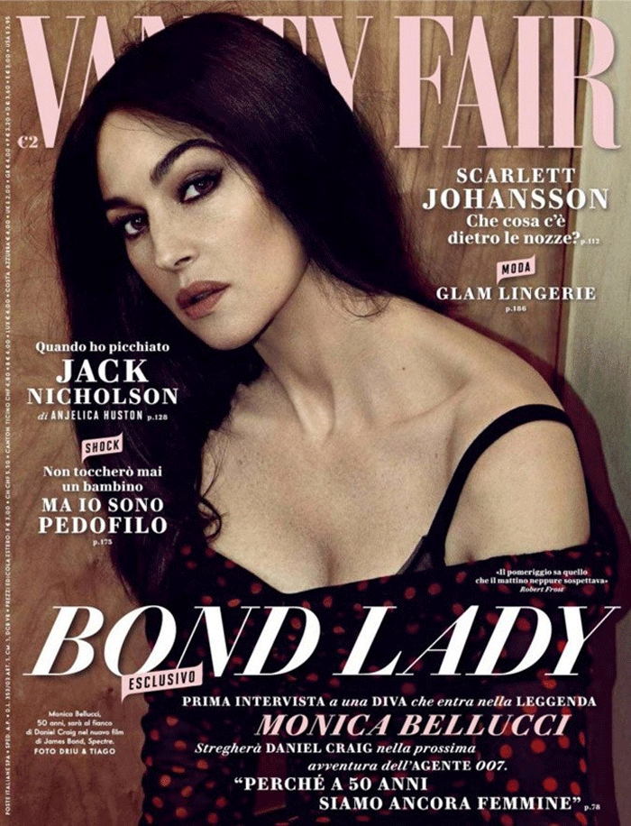 Στο εξώφυλλο του περιοδικού «Vanity Fair» της ιταλικής έκδοσης του Δεκεμβρίου φιλοξενείται η 50χρονη Ιταλίδα ηθοποιός Monica Bellucci, στα πλαίσια της προώθησης της νέας ταινίας του James Bond, «Spectre», στην οποία υποδύεται το κορίτσι του πρωταγωνιστή Daniel Craig. Είναι μάλιστα η πρώτη φορά στα χρονικά των ταινιών James Bond που ένα Bond girl έχει αυτήν την ηλικία.