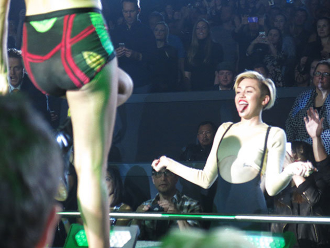 Η Miley Cyrus δεν σταματά να προκαλεί! Η 21χρονη τραγουδίστρια παρευρέθηκε στο σόου της Britney Spears και δεν έκατσε ήσυχη ούτε ένα λεπτό, αφού όποιον και όποια έβρισκε, τους φιλούσε και τους χαϊδευε.