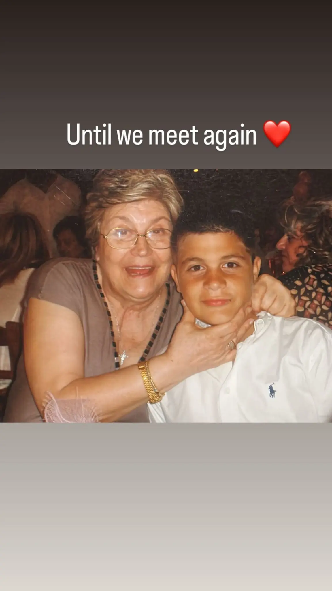 Συγκεκριμένα, δημοσίευσε μια φωτογραφία από τα παιδικά του χρόνια, στην οποία ποζάρει δίπλα στη γιαγιά του. Το στιγμιότυπο συνόδευσε με τη φράση: «Μέχρι να συναντηθούμε ξανά».