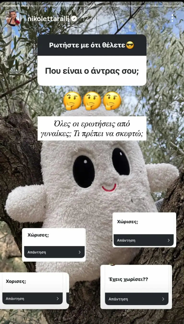 Οι followers της παρουσιάστριας λοιπόν την ρώτησαν «Πού είναι ο άντρας σου;» και αν έχει χωρίσει. Η Νικολέττα Ράλλη δεν θέλησε να απαντήσει ανοιχτά στο αν χώρισε ή όχι, γράφοντας: «Όλες οι ερωτήσεις από γυναίκες; Τι πρέπει να σκεφτώ;».