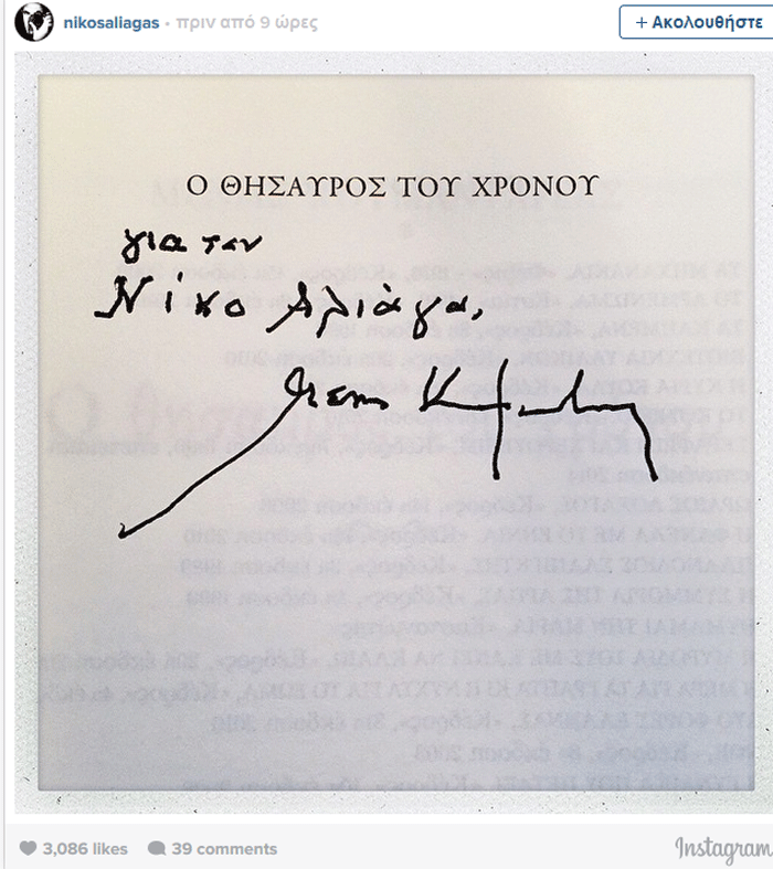 «Ένας φίλος μου άφησε σήμερα στο γραφείο μου στο Παρίσι, αυτό το βιβλίο του Μένη Κουμανταρέα το οποίο μου αφιέρωσε πριν λίγο καιρό. Συγκινητικά τα παιχνίδια του χρόνου. Οι ιδέες και οι λέξεις δεν πεθαίνουν πότε», έγραψε ο παρουσιαστής στον λογαριασμό του στο instagram, ανεβάζοντας μία φωτογραφία με την ιδιόχειρη αφιέρωση του συγγραφέα.