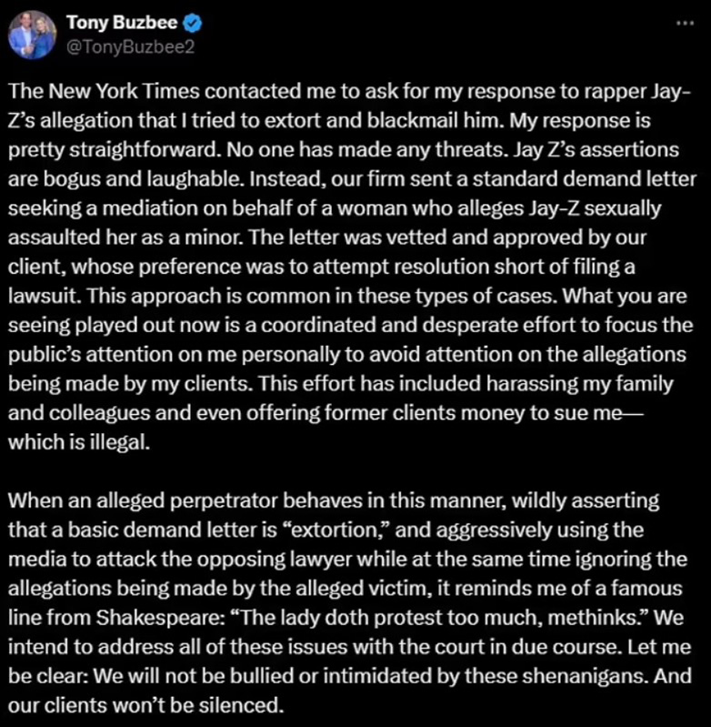 Ο κ. Buzbee δήλωσε: «Οι New York Times επικοινώνησαν μαζί μου για να ζητήσουν την απάντησή μου στον ισχυρισμό του ράπερ Jay-Z ότι προσπάθησα να τον εκβιάσω. Η απάντησή μου είναι αρκετά απλή. Κανείς δεν απείλησε κανέναν. Οι ισχυρισμοί του Jay-Z είναι ψευδείς και γελοίοι. Αντιθέτως, η εταιρεία μας έστειλε μια τυπική επιστολή απαίτησης που ζητούσε διαμεσολάβηση για λογαριασμό μιας γυναίκας που ισχυρίζεται ότι ο Jay-Z την κακοποίησε σεξουαλικά όταν ήταν ανήλικη».