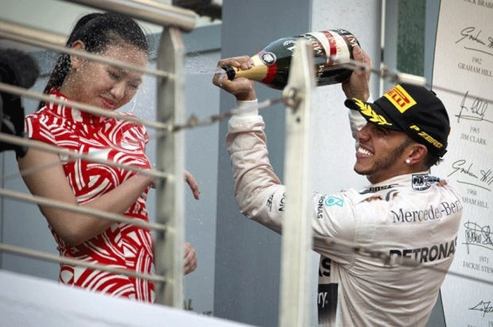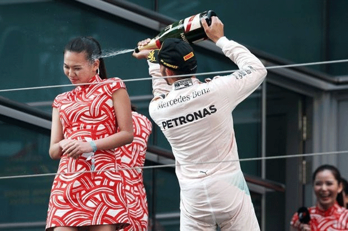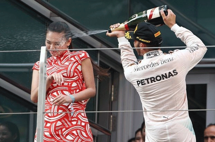 Ο οδηγός της Mercedes και περσινός Παγκόσμιος Πρωταθλητής της Formula 1, έλουσε με σαμπάνια ένα από τα κορίτσια που βρίσκονταν στο βάθρο της απονομής, ρίχνοντάς της σαμπάνια απευθείας στο πρόσωπο.