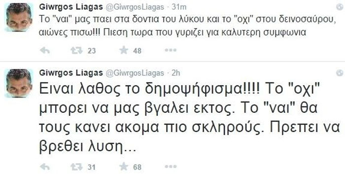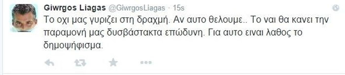 Ο Γιώργος Λιάγκας μέσω Twitter εξέφρασε την άποψη του για το επερχόμενο δημοψήφισμα.