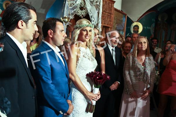 Η νύφη έφθασε στην εκκλησία συνοδευόμενη από τον πατέρα της, Νίκο, και έλαμπε μέσα στο δαντελένιο στενό νυφικό, του οίκου μόδας Ρενέ Αντωνόπουλος, με το υπέροχο τελείωμα στην πλάτη, ενώ στα μαλλιά της ήταν στερεωμένο ένα στεφανάκι με άνθη γυψοφίλης.