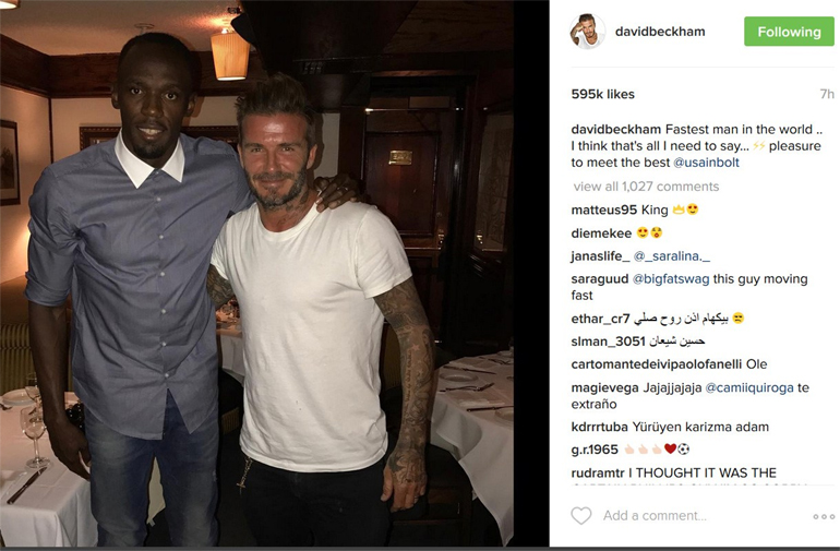 Ο λόγος για τον David Beckham και τον Usain Bolt που συναντήθηκαν στο ίδιο εστιατόριο και δεν μπόρεσαν να κρύψουν τον ενθουσιασμό τους που γνωρίστηκαν επιτέλους.