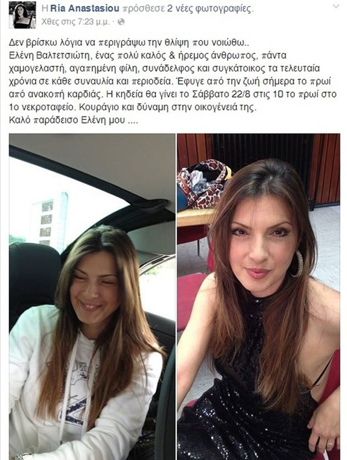 Έφυγε απ’τη ζωή την Παρασκευή 21 Αυγούστου γνωστή τραγουδίστρια και συνεργάτιδα του Γιάννη Πάριου από ανακοπή καρδιάς. Τη θλιβερή είδηση ανακοίνωσε μέσω facebook η φίλη της και συνάδελφος Ρία Αναστασίου.