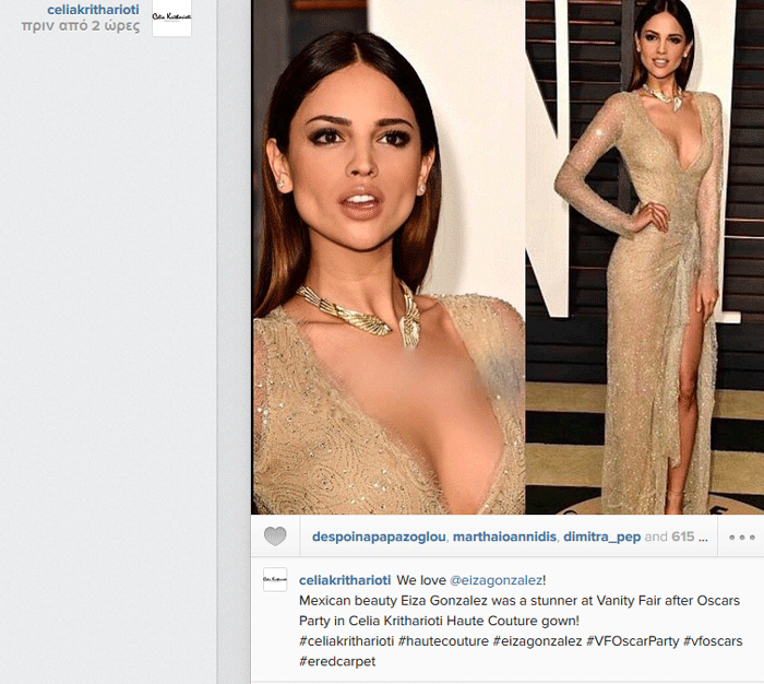 Τουαλέτα της Ελληνίδας σχεδιάστριας φόρεσε και η διάσημη Μεξικανή ηθοποιός και τραγουδίστρια η Eiza Gonzalez στο πάρτι του Vanity Fair μετά το τέλος της 87ης απονομής των βραβείων Όσκαρ.