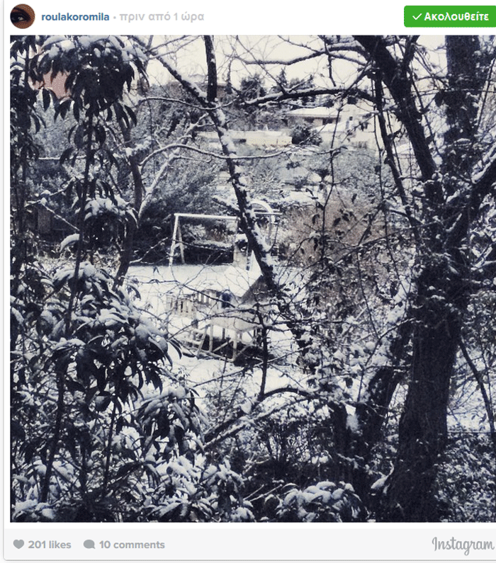 Ο λόγος για την Ρούλα Κορομηλά, που αυτές τις μέρες δε λέει να βγει από το σπίτι και χαίρεται σα μικρό παιδί το χιονισμένο τοπίο.