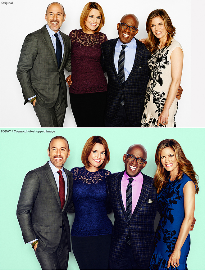 Μια φαινομενικά κανονική φωτογραφία των τεσσάρων παρουσιαστών του τηλεοπτικού προγράμματος «Today Show» . Τα σχήματα, οι κύκλοι και τα βέλη δείχνουν τις αδυναμίες των παρουσιαστών που πρέπει να διορθωθούν στο Photoshop πριν δημοσιευθεί η φωτογραφία.