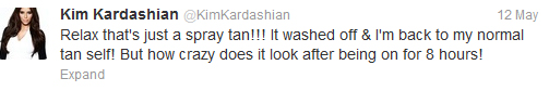 Λίγη ώρα αργότερα, προκειμένου να κατευνάσει τα πλήθη, επανήλθε με ένα σχόλιο: «Ηρεμήστε. Ήταν απλώς σπρέι μαυρίσματος. Πλύθηκα και επανήλθα στη φυσική μου όψη. Κοιτάξτε όμως πώς γίνεται, αν το αφήσεις οκτώ ώρες».