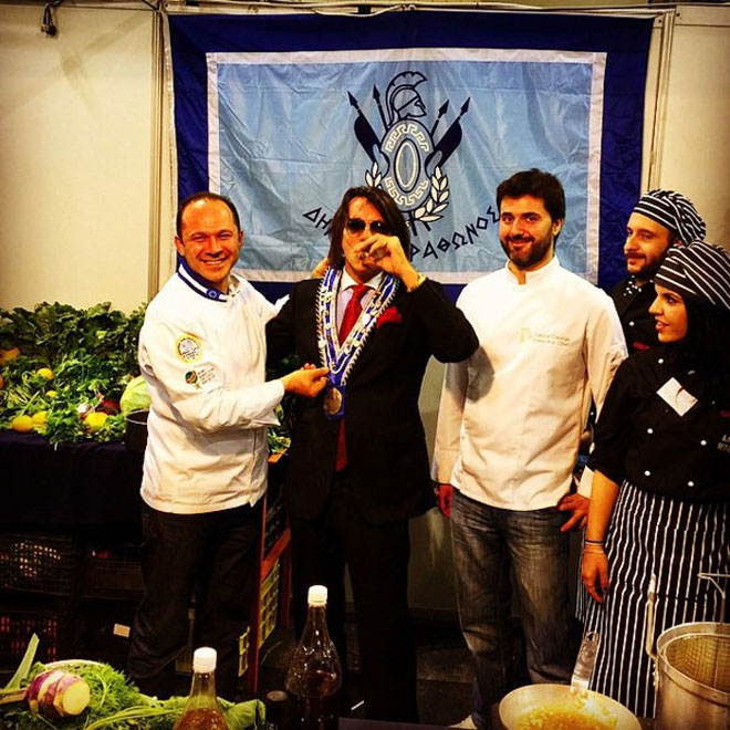 Όχι ο δήμαρχος Μαραθώνα Ηλίας Ψινάκης δεν διασκεδάζει σε κάποιο τσιπουράδικο με τους φίλους του αλλά βρίσκεται μέσα από το περίπτερο που έχουν οι παραγωγοί του Μαραθώνα με τα τρόφιμα και τα ποτά της περιοχής και τους στηρίζει.
