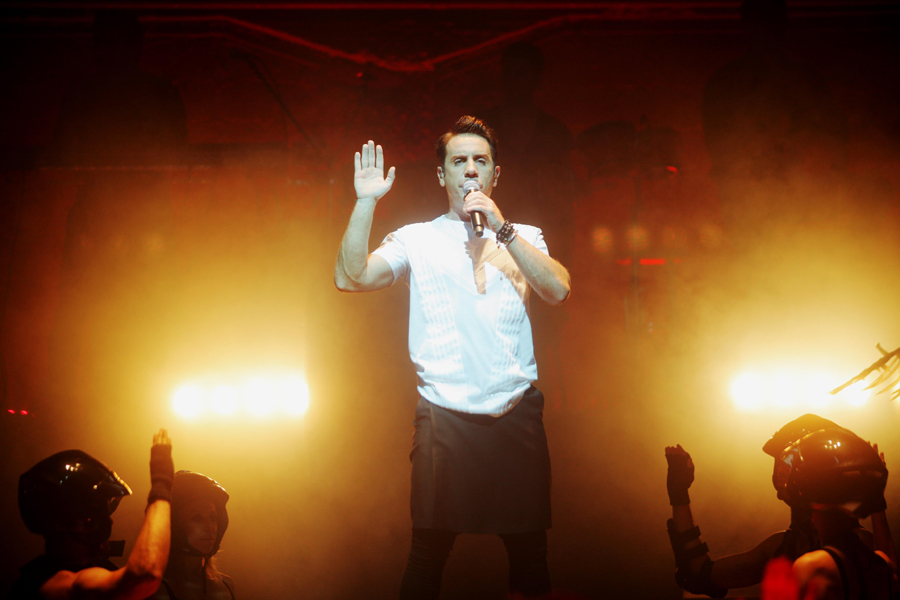 Με πολύ κέφι, ο Γιώργος Μαζωνάκης, όπως πάντα ανατρεπτικός, εμφανίστηκε στην σκηνή με το παντελόνι-φούστα.
