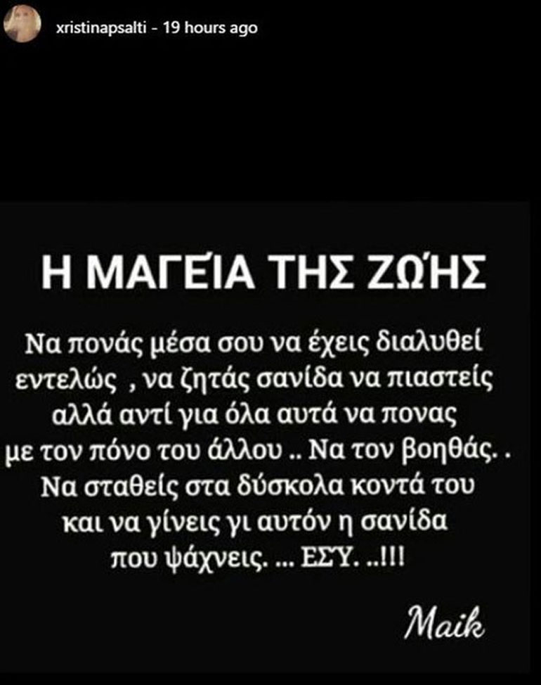 Η ηθοποιός δημοσίευσε στα social media κάποια λόγια που καθρεφτίζουν όλα όσα αισθάνεται. «Η μαγεία της ζωής. Να πονάς μέσα σου, να έχεις διαλυθεί εντελώς, να ζητάς σανίδα να πιαστείς και αντί για όλα αυτά, να πονάς με τον πόνο του άλλου. Να τον βοηθάς. Να σταθείς στα δύσκολα κοντά του και να γίνεις γι’ αυτόν η σανίδα που ψάχνεις… Εσύ».