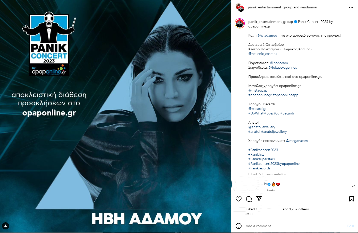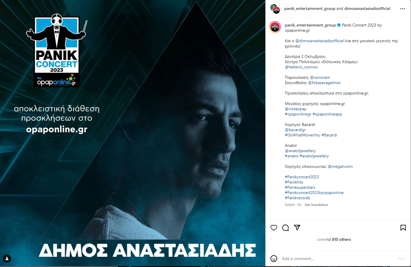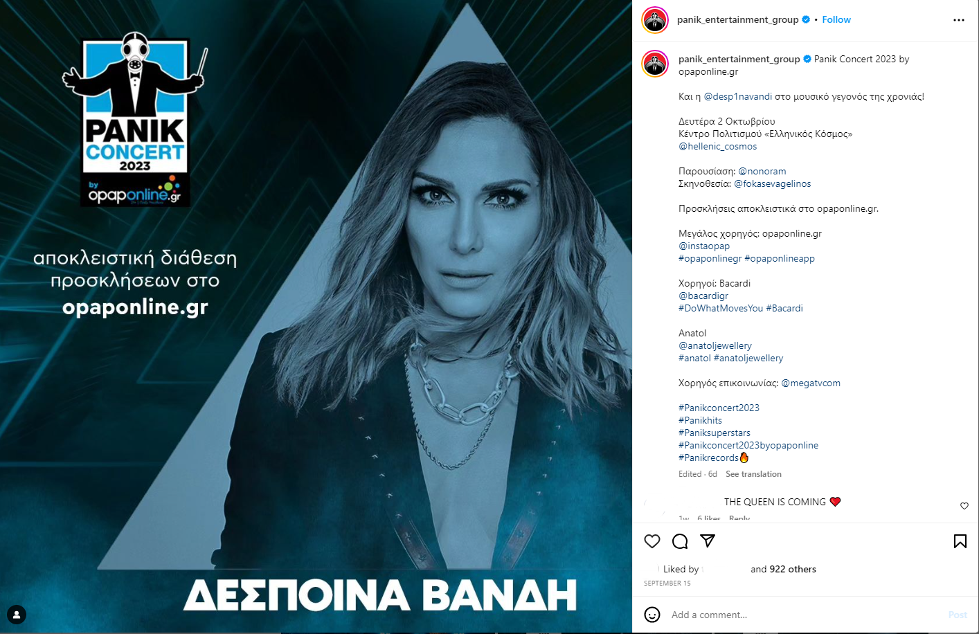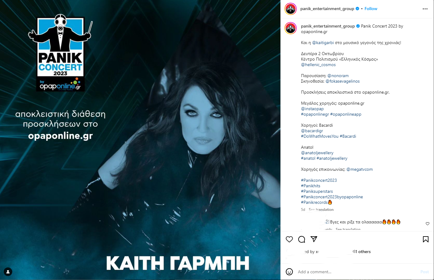 Αντώνης Ρέμος, Κωνσταντίνος Αργυρός, Ελένη Φουρέιρα, Δέσποινα Βανδή, Καίτη Γαρμπή, Μελίνα Ασλανίδου, Πέγκυ Ζήνα, Πέτρος Ιακωβίδης, Πάολα, Έλλη Κοκκίνου, Josephine, Ηλίας Βρεττός, Λένα Ζευγαρά, Ήβη Αδάμου, Κατερίνα Λιόλιου, FY, Light, Trannos, Playmen, Δήμος Αναστασιάδης, Νίκος Απέργης, Γιώργος Λιβάνης, Θοδωρής Φέρρης, Τάνια Μπρεάζου και πολλοί ακόμη αγαπημένοι καλλιτέχνες, που θα βρεθούν στη σκηνή του Panik Concert, μας προσκαλούν μέσα από τα social media στο μεγαλύτερο μουσικό event της χρονιάς!