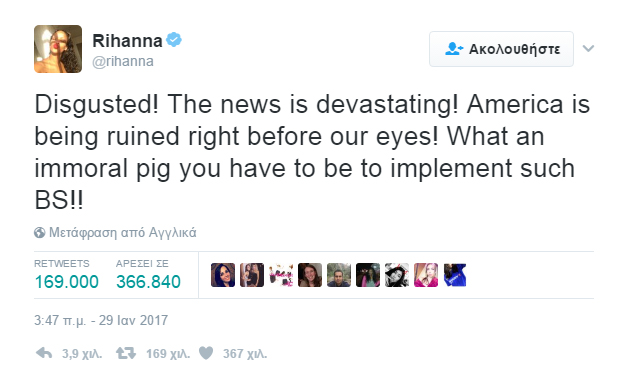 Με μια ανάρτηση στον προσωπικό της λογαριασμό στο Twitter θέλησε η Rihanna να εκφράσει την αγανάκτηση της για το διάταγμα του Donald Trump στο οποίο απαγορεύει την είσοδο μουσουλμάνων και προσφύγων στις ΗΠΑ, από επτά χώρες.