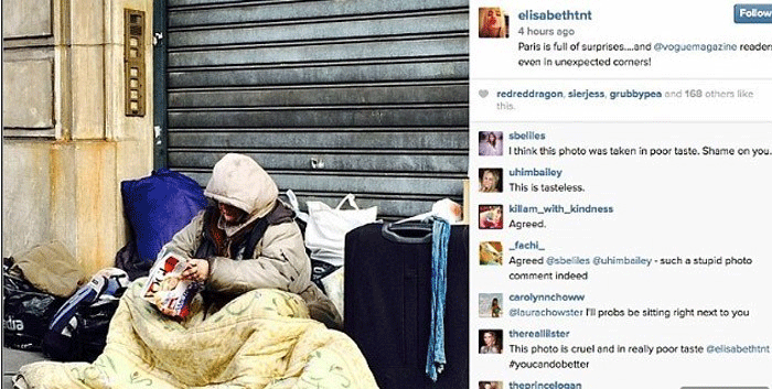 H συντάκτρια ανέβασε το Σάββατο στο Instagram τη φωτογραφία μιας άστεγης στο Παρίσι, να διαβάζει μία έκδοση της Vogue. Η ίδια σχολίασε: «Το Παρίσι είναι όλο εκπλήξεις. Και oι αναγνώστες του περιοδικού Vogue βρίσκονται στις πιο απρόσμενες γωνιές!».