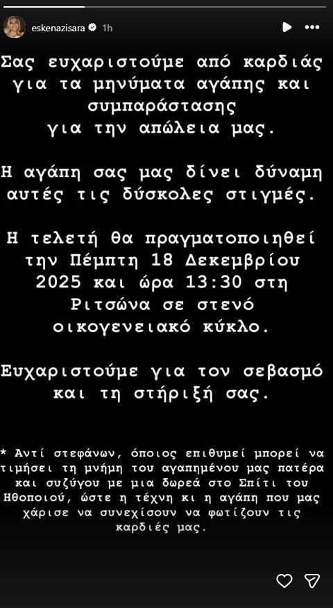 «Σας ευχαριστούμε από καρδιάς για τα μηνύματα αγάπης και συμπαράστασης για την απώλεια μας. Αντί στεφάνων, όποιος επιθυμεί μπορεί να τιμήσει τη μνήμη του αγαπημένου μας πατέρα και συζύγου με μία δωρεά στο σπίτι του ηθοποιού, ώστε η τέχνη και η αγάπη που μας χάρισε να συνεχίσουν να φωτίζουν τις καρδιές μας», έγραψε η Σάρα Εσκενάζυ και ευχαρίστησε όσους την συλλυπήθηκαν.