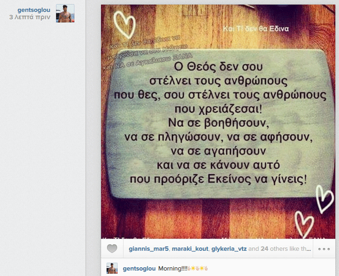Ο γνωστός ποδοσφαιριστής και σύντροφος της Αγγελικής Ηλιάδη με αυτόν τον περίεργο τρόπο θέλησε να καλημερίσει τους followers του. Όσο για το τι μπορεί να τον ώθησε στο να δημοσιεύσει κάτι τέτοιο, μέχρι στιγμής παραμένει άγνωστο, αφού ο ίδιος δεν έδωσε περισσότερες λεπτομέρειες.