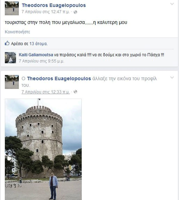 Το τραγικό είναι ότι δυο μέρες πριν το μοιραίο, ο πρώην σύζυγος της Θεόδωρος Ευαγγελόπουλος έκανε συνεχώς αναρτήσεις στο Facebook, δείχνοντας χαρούμενος και σχεδιάζοντας τις Πασχαλινές διακοπές του στην Θεσσαλονίκη.
