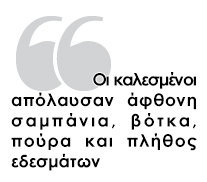 Όσο για τα… αναλώσιμα, αξίζει να αναφερθεί ότι λίγο πριν από την άφιξη των καλεσμένων δώδεκα νταλίκες, φορτωμένες με τα «άκρως απαραίτητα», έφτασαν στον Σκορπιό, προκειμένου να μη λείψει τίποτα στην Εκατερίνα και στους φίλους της. Τα φορτηγά μετέφεραν μεταξύ άλλων άφθονη σαμπάνια, βότκα και άλλα αλκοολούχα ποτά, πούρα, λουλούδια, πλήθος εδεσμάτων, ντόπιων αλλά και ρωσικών.