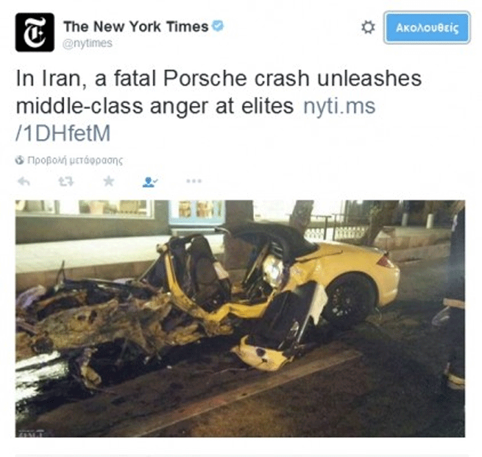 Μια πλούσια και διάσημη 20χρονη σκοτώθηκε οδηγώντας την κίτρινη Πόρσε της στην Τεχεράνη. Η σελίδα της στο Instagram γέμισε αμέσως από μηνύματα μίσους στο πρόσωπό της.