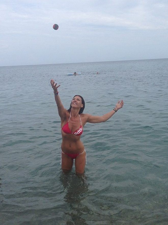 Η καλλίγραμμη γυμνάστρια μένει σε μια πανέμορφη βίλα, την οποία και νοικιάζουν και όλη μέρα είναι με τους γιους της στην πισίνα! Φυσικά κάνει και τις βουτιές της στη θάλασσα και αναστατώνει τους λουόμενους!