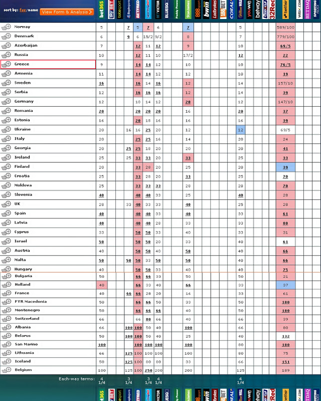 Η Ελλάδα και το τραγούδι με το οποίο θα διαγωνιστεί στην Eurovision είναι στην 5η θέση στα γραφεία στοιχημάτων, όπως μας ενημερώνει το Infe Greece, το Ελληνικό σωματείο φίλων της Eurovision που παρακολουθεί από κοντά τον θεσμό.