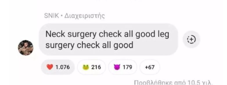 Στο κανάλι επικοινωνίας του στο Instagram, αποκάλυψε πως υποβλήθηκε σε χειρουργείο στον λαιμό του όσο και στο πόδι του, τα οποία πήγαν καλά, χωρίς ωστόσο να δώσει περισσότερες λεπτομέρειες.