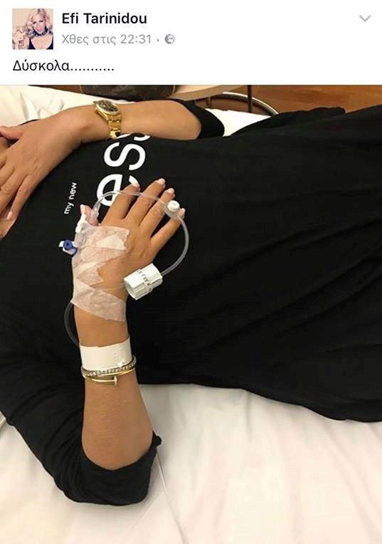 Η τραγουδίστρια έβγαλε μια φωτογραφία από το κρεβάτι του νοσοκομείου με ορό στο χέρι και ανήρτησε το στιγμιότυπο στον προσωπικό της λογαριασμό στο Facebook. Στη λεζάντα της εικόνας δεν αποκαλύπτει πολλά, καθώς αρκέστηκε να γράψει μόνο: «Δύσκολα…».