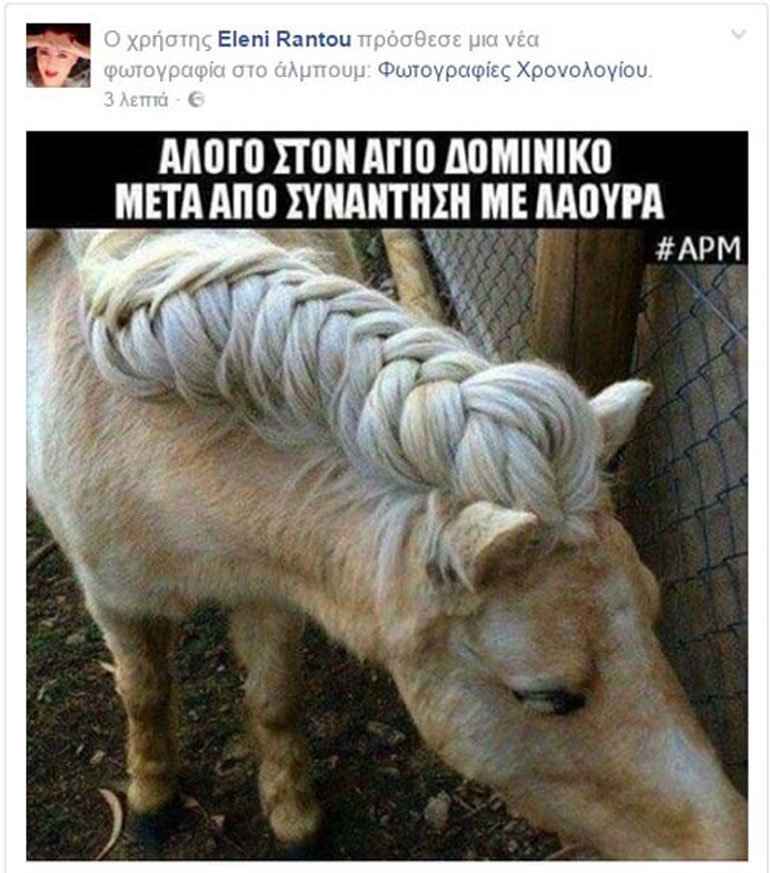 Η δημοφιλής ηθοποιός λοιπόν ανέβασε μία φωτογραφία ενός αλόγου που δείχνει την αλογοουρά του να έχει γίνει κοτσίδα από τα χέρια της Λάουρα Νάργες, η οποία ως γνωστόν επιμελείται την κώμη των κοριτσιών στο Survivor για να είναι περιποιημένες τις ημέρες των αθλημάτων.