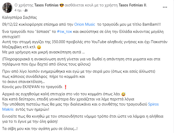 Όπως αναφέρει στο μήνυμά του ο Τάσος Φωτινιάς, έξι μήνες μετά την κυκλοφορία του νέου του τραγουδιού, ο συνθέτης του, Σπύρος Μακρής το πούλησε και σε άλλον τραγουδιστή!