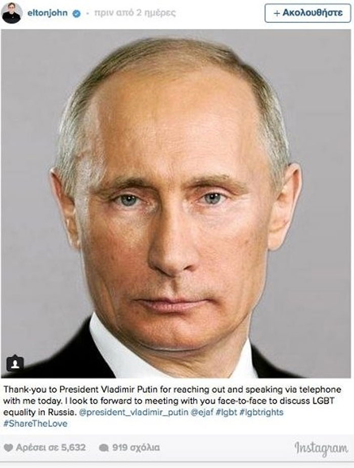 «Ευχαριστώ τον πρόεδρο Πούτιν που επικοινώνησε και μίλησε μαζί μου στο τηλέφωνο σήμερα. Ανυπομονώ να σας συναντήσω πρόσωπο με πρόσωπο και να συζητήσουμε το θέμα της ισότητας για LGTB στη Ρωσία», ανακοίνωσε με πολύ καμάρι στον λογαριασμό του στο Instagram ο Έλτον Τζον.
