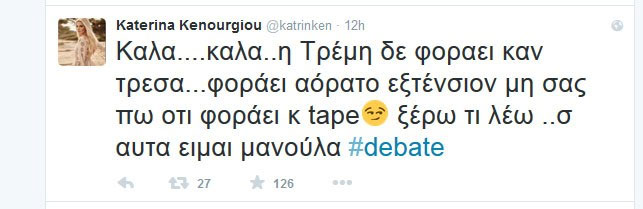 «Kαλά…καλά. Η Τρέμη δεν φοράει καν τρέσα…φοράει αόρατο εξτένσιον μην σας πω ότι φοράει και tape…Ξέρω τι λέω. Σε αυτά είμαι μανούλα», σχολίασε η παρουσιάστρια για την στιλιστική εμφάνιση της δημοσιογράφου.