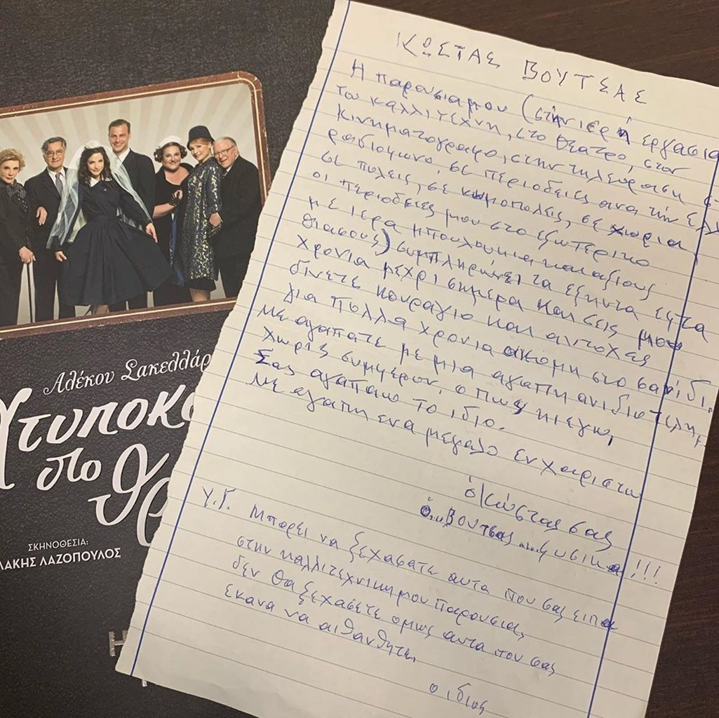 Συγκεκριμένα, στον επίσημο λογαριασμό τους στο Instagram αναρτήθηκε μια φωτογραφία, στην οποία απεικονιζόταν ένα ιδιόχειρο σημείωμα του Κώστα Βουτσά και μία φωτογραφία από την τελευταία συνεργασία τους, στην παράσταση «Χτυποκάρδια στο θρανίο» .