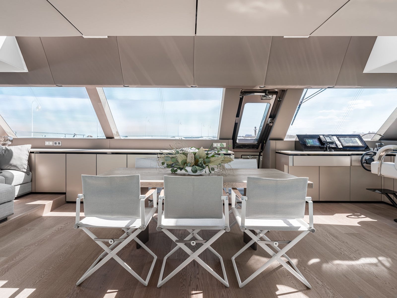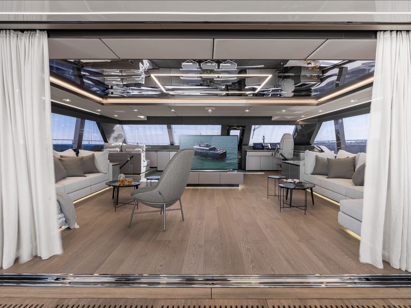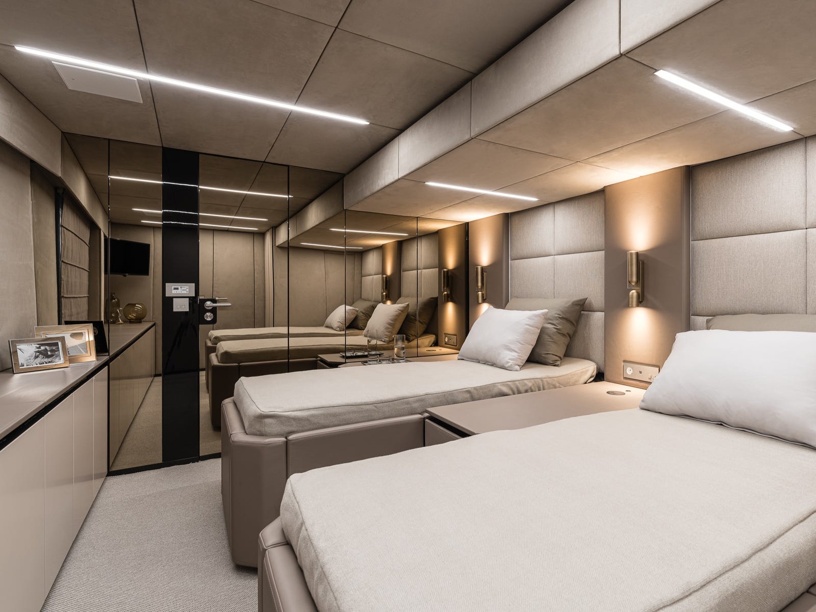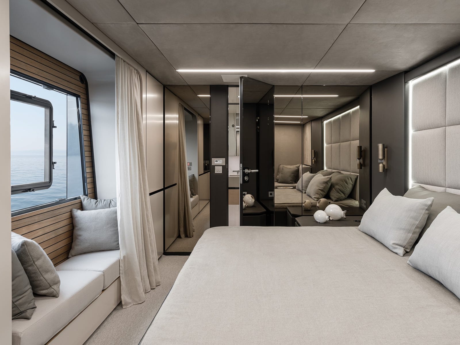 Το εσωτερικό του είναι ευρύχωρο, φτάνοντας τα 1.200 τ.μ. Περιλαμβάνει ένα σαλόνι στο κεντρικό κατάστρωμα με άμεση πρόσβαση στον μπροστινό εξωτερικό χώρο, πολυτελείς καμπίνες για τους φιλοξενούμενους και τη σουίτα των ιδιοκτητών με δικό της μπάνιο και πριβέ μπαλκόνι.