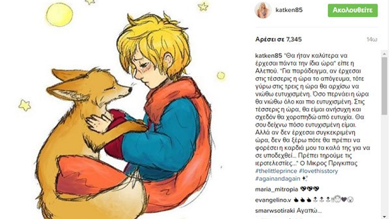 Το κεφάλαιο «Σταθοκωστόπουλος» όχι μόνο έχει κλείσει για την ίδια, αλλά το έχει αφήσει και πολύ πίσω της , κάτι όμως την χάλασε όπως φαίνεται γράφοντας στον προσωπικό της λογαριασμό στο twitter :« Θα ήταν καλύτερα να έρχεσαι πάντα την ίδια ώρα» ενώ λίγο αργότερα στο instagram ανέβασε ολόκληρο το απόσπασμα από τον «Μικρό πρίγκιπα» και την ιστορία με την αλεπού…