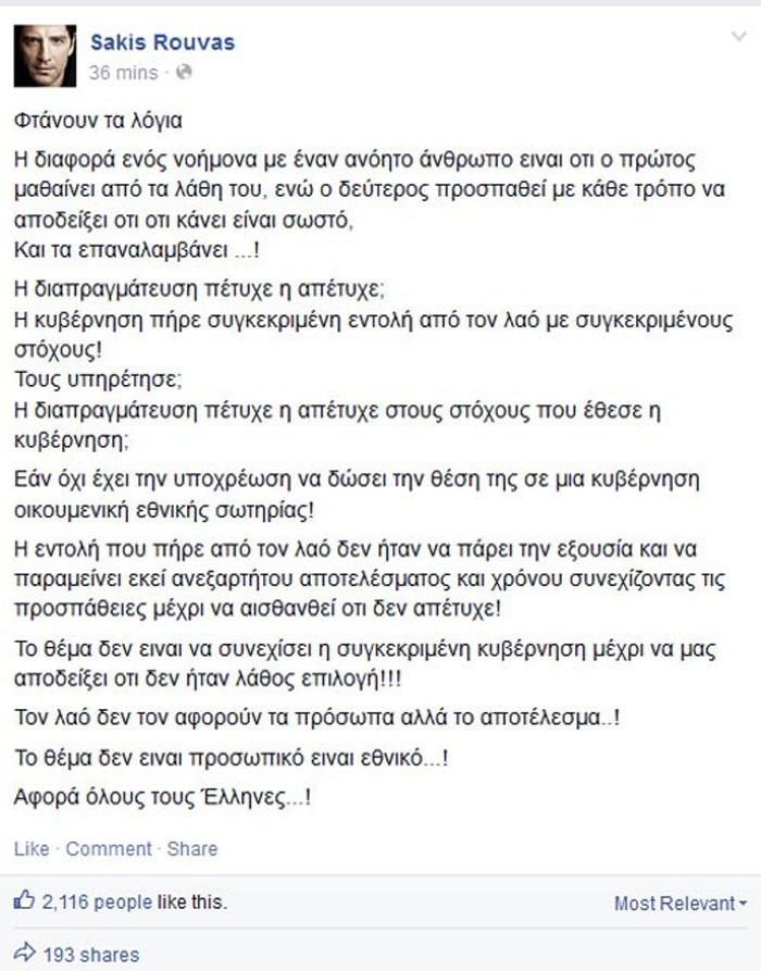 Αφορά όλους τους Έλληνες…!», με αυτά τα λόγια στον λογαριασμό του στο facebook, o Σάκης Ρουβάς σχολίασε τις πολιτικές εξελίξεις, το δημοψήφισμα και τη διαπραγματευτική πορεία της κυβέρνησης.