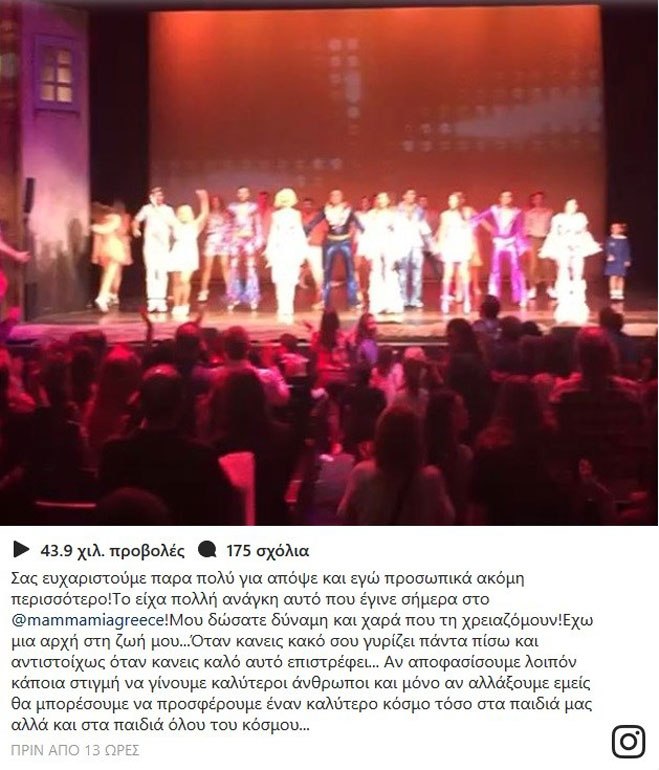 «Σας ευχαριστούμε πάρα πολύ για απόψε και εγώ προσωπικά ακόμη περισσότερο! Το είχα πολλή ανάγκη αυτό που έγινε σήμερα στο @mammamiagreece! Μου δώσατε δύναμη και χαρά που τη χρειαζόμουν! Έχω μια αρχή στη ζωή μου…
