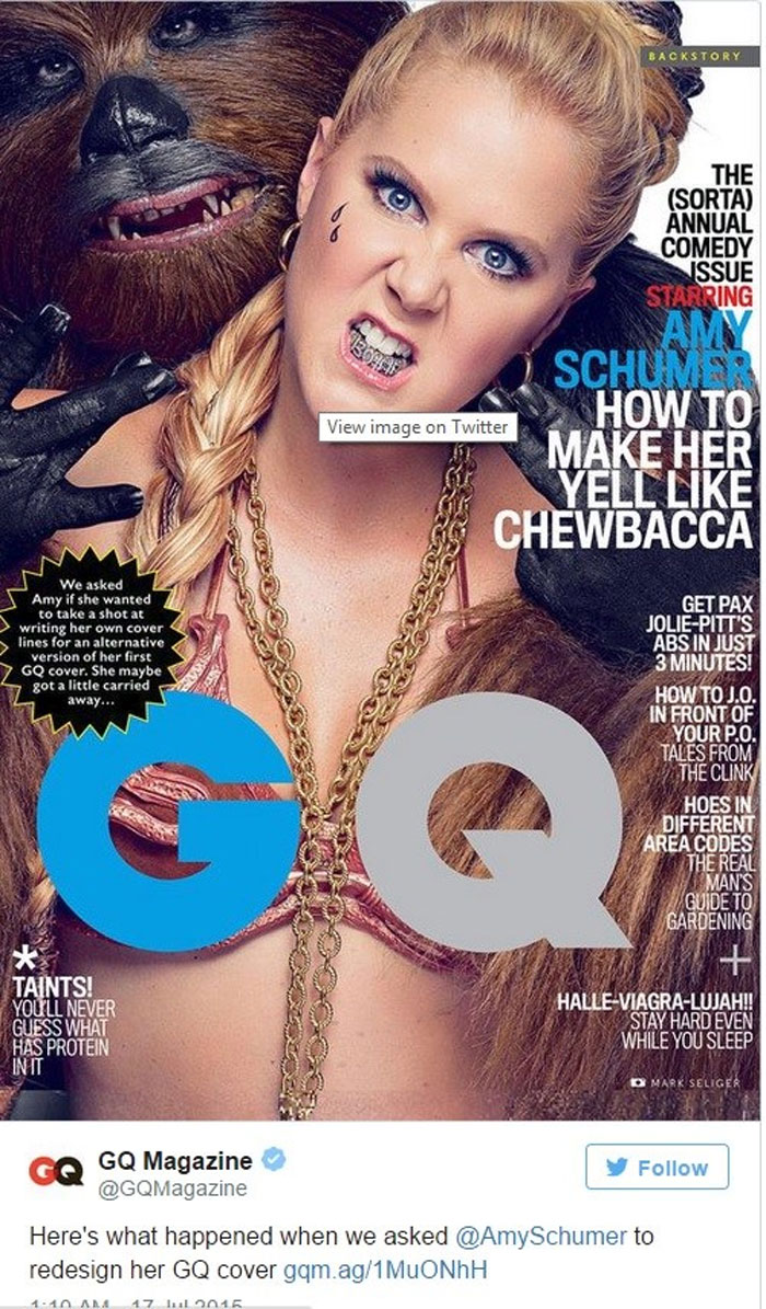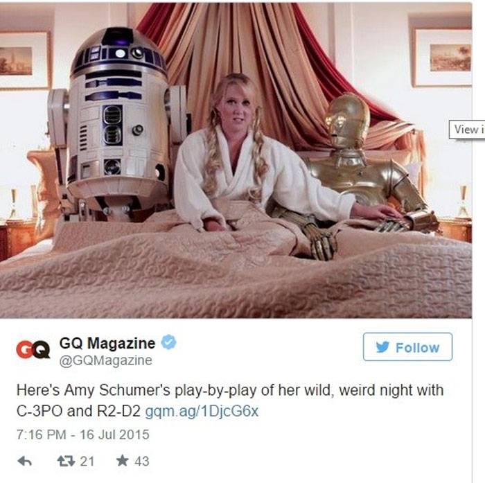 Δυσαρεστημένη έμεινε η ομάδα του Star Wars από τη νέα σέξι και προκλητική φωτογράφιση που έκανε η κωμικός Amy Schumer για το περιοδικό GQ. Η ηθοποιός συγκεκριμένα στο εξώφυλλο τη βλέπουμε να έχει βάλει στο στόμα της το δάχτυλο του C-3PO, ενώ στο εσωτερικό του βρίσκεται μαζί στο κρεβάτι με τα δύο ρομπότ του σύμπαντος του Τζορτζ Λούκας, τον C-3P0 και τον R2-D2.