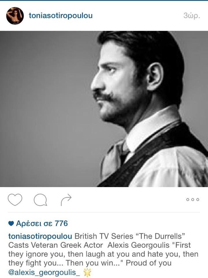 Ο Αλέξης Γεωργούλης μαζί με τον Γιώργο Καραμίχο θα παίξουν στη βρετανική τηλεοπτική σειρά «The Durell’s» και η αγαπημένη του Αλέξη, Τόνια Σωτηροπούλου έδειξε πόσο χαρούμενη είναι γι’αυτό, μέσα από τον λογαριασμό της στο instagram. Η Τόνια ανέβασε μία φωτογραφία του ηθοποιού, γράφοντας πόσο περήφανη είναι για την επιτυχία του!