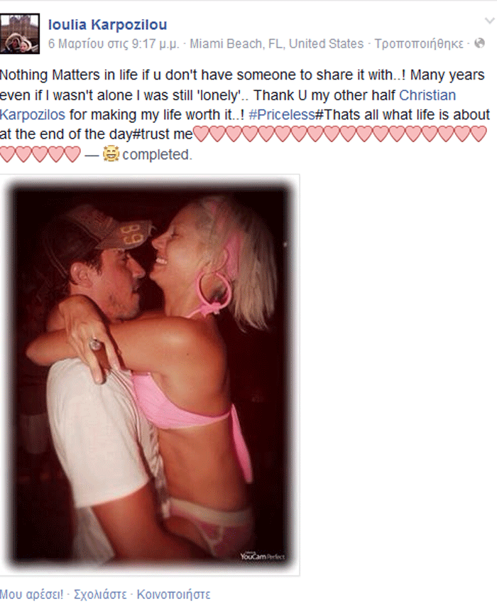 «Τίποτα δεν έχει σημασία στη ζωή, αν δεν έχετε κάποιον να τη μοιραστείτε! Πολλά χρόνια ακόμη και όταν δεν ήμουν μόνη, ένιωθα «μόνη»…Ευχαριστώ το άλλο μου μισό Κριστιάν Καρποζήλο γιατί κάνει τη ζωή μου να αξίζει… ! #Priceless #Αυτό είναι η ζωή, στο τέλος της μέρας …εμπιστοσύνη» έγραψε το μοντέλο και δημοσίευσε μια φωτογραφία τους από το καλοκαίρι που είναι αγκαλιασμένοι.