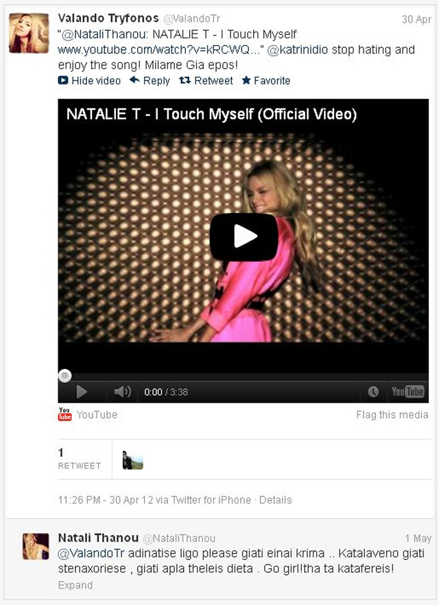 H νικήτρια του Greek Idol Ι το έκανε retweet με το εξής σχόλιο: «Stop hating and enjoy the song! (Σταμάτα να το μισείς και ευχαριστήσου το τραγούδι) Μιλάμε για έπος!». «Αδυνάτισε λίγο please, γιατί είναι κρίμα… Καταλαβαίνω γιατί στεναχωριέσαι. Γιατί απλά θέλεις δίαιτα. Go girl! (Προχώρα κορίτσι!) Θα τα καταφέρεις!», απάντησε η Νάταλι Θάνου. «Είναι το καλύτερο που μπορείς να κάνεις;» , ήταν η άμεση αντίδραση της Βαλάντως Τρύφωνος.